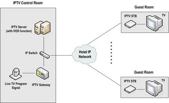 Our IPTV Solution comprise of IPTV Gateway (max 8 video source/input) , IPTV Server (to host VOD files) software and hardware, standard/existing IP Switch and IPTV SetupBox which is connected to the TV in the room via LAN.