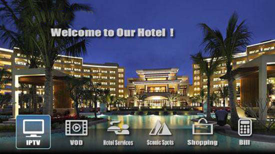 Our IPTV Solution can display HD adverting video provided by the customer. Usually, the HD advertising video is composed of hotel video introduction, a new movie preview, etc. I can also display greeting word/ Hotel guest name when they turn on STB.