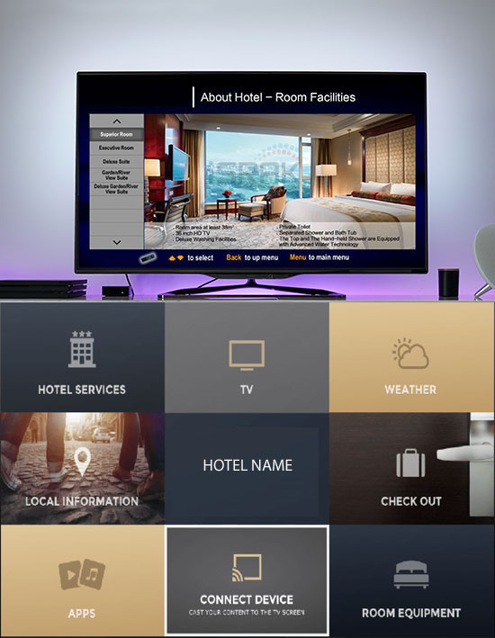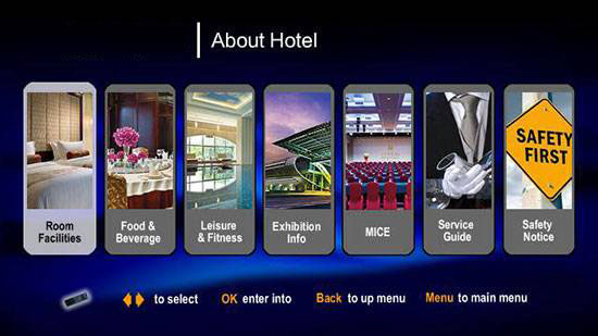 Provide interactive information content such as Hotel information, Events and happening, Airport and transportation information, Tourist Guide and attraction. The contents of Hotel interactive content can be changed according to the Hotel request. It also support Scrolling Text Message for advertisement or important information, displayed on top/bottom of TV screen.